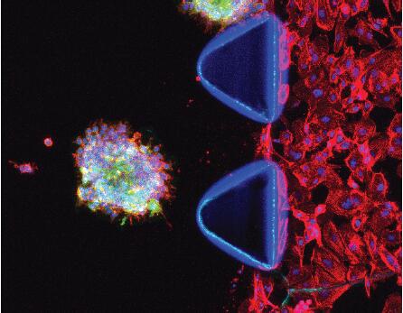 (1)播散:癌細胞球體分布情況監(jiān)測用于建立發(fā)生在癌癥早期階段的轉(zhuǎn)移模型(EMT)。癌細胞球體可以被植入AIM芯片的3D水凝膠網(wǎng)絡(luò)中,而且可以和其他細胞(如內(nèi)皮細胞)共培養(yǎng)以便于更準確地模擬腫瘤微環(huán)境。
